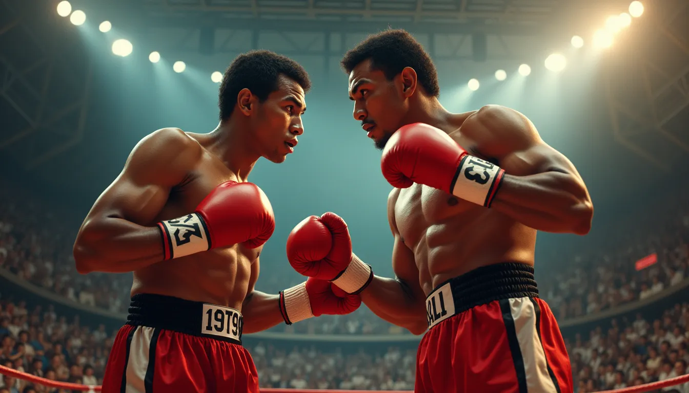 Design a vivid and thrilling scenario set in an Olympic boxing ring. Two fiercely competitive players are intensely locking eyes, radiating an almost palpable tension that electrifies the atmosphere. One of them is none other than the legendary fighter, Mohammad Ali. He stands powerfully, exuding a visible aura of raw power and determination, his eyes are burning with resolve and lingering anger. His opponent, not giving an inch, matches his glare with a defiant one. The crowd collectively holds their breath, anxiety and excitement shimmering in the air, as they eagerly anticipate the arena to explode into a thrilling dance of technique, strength, and sheer determination.