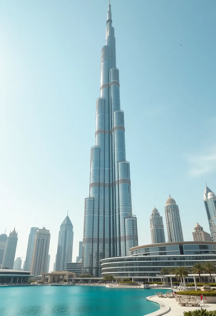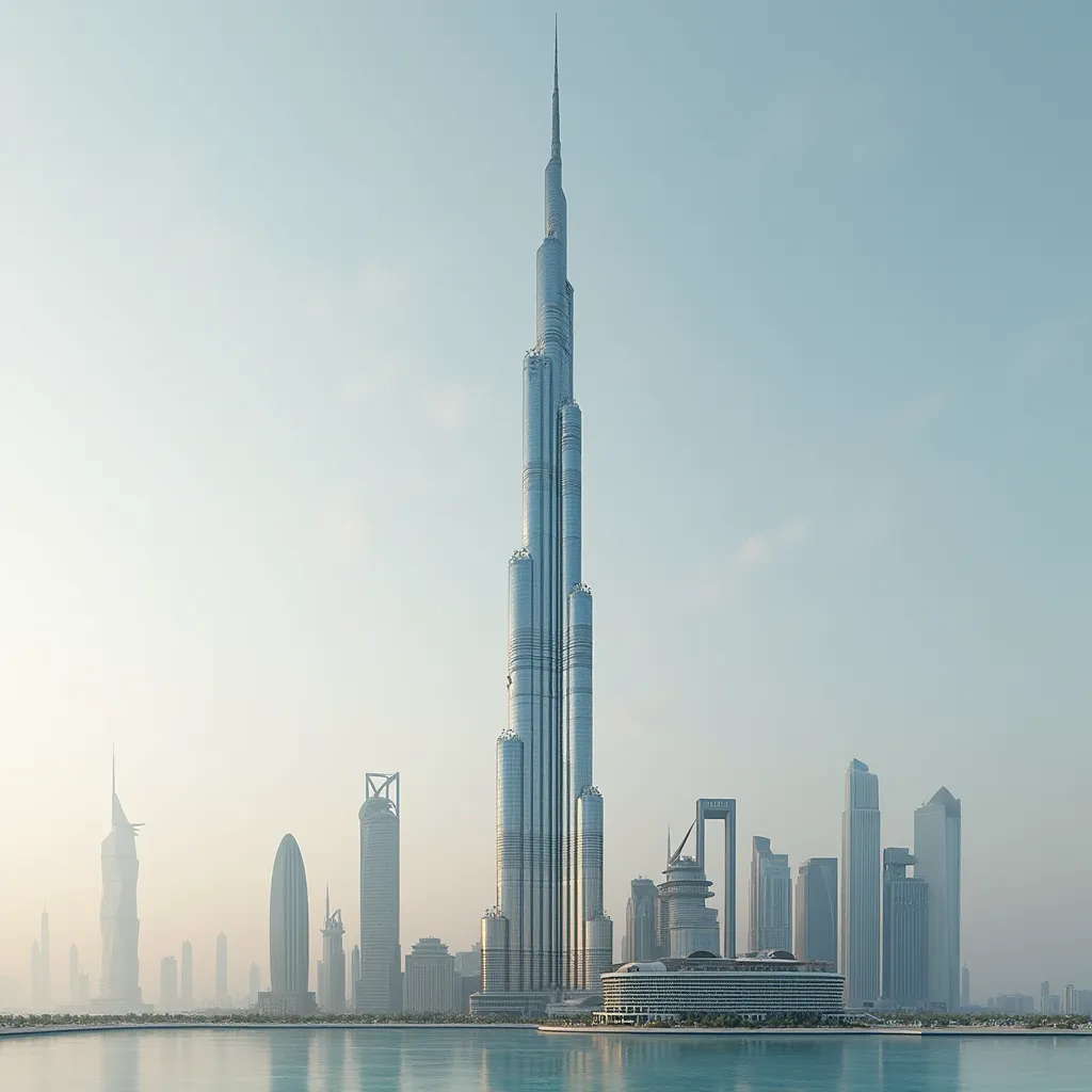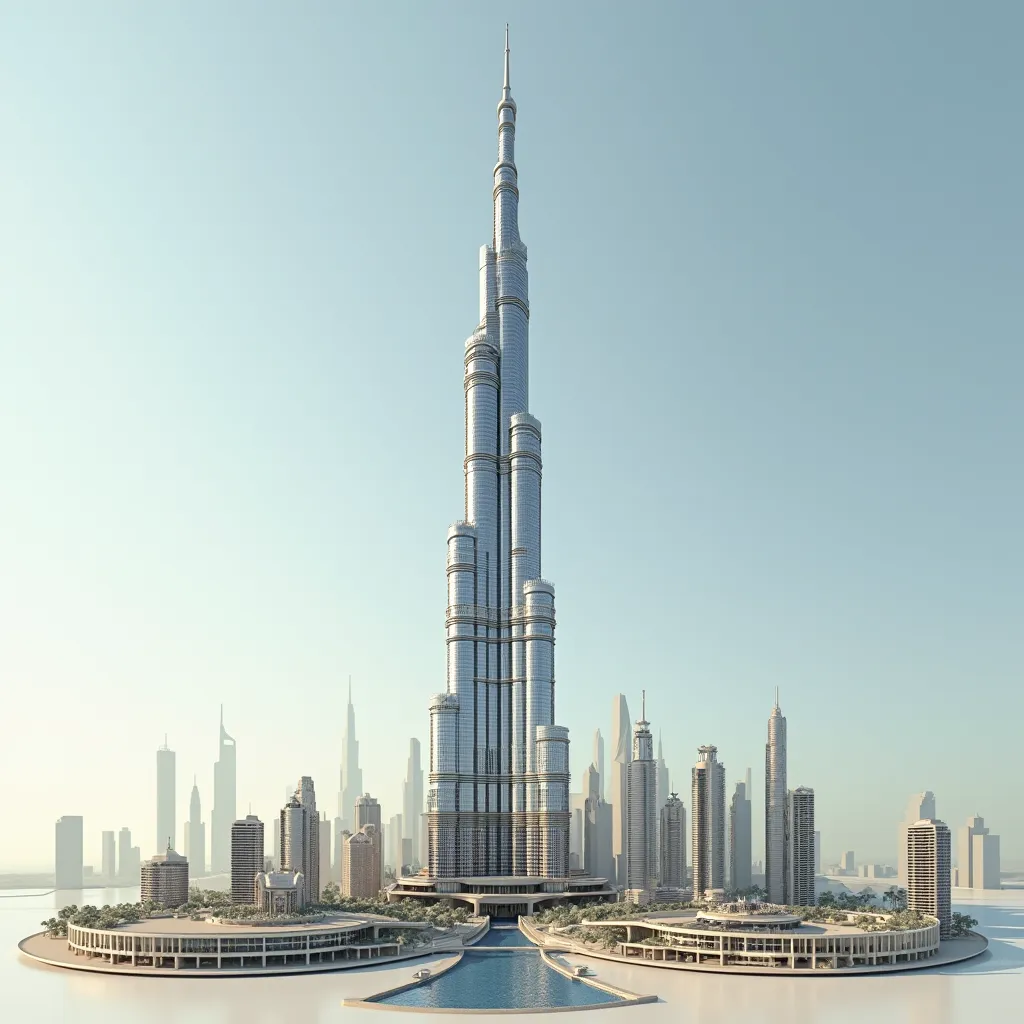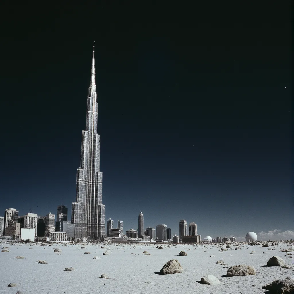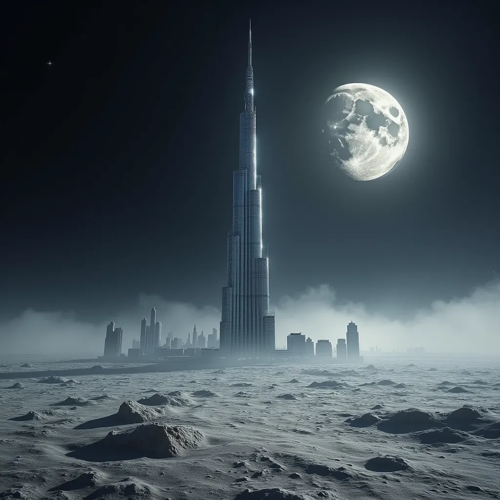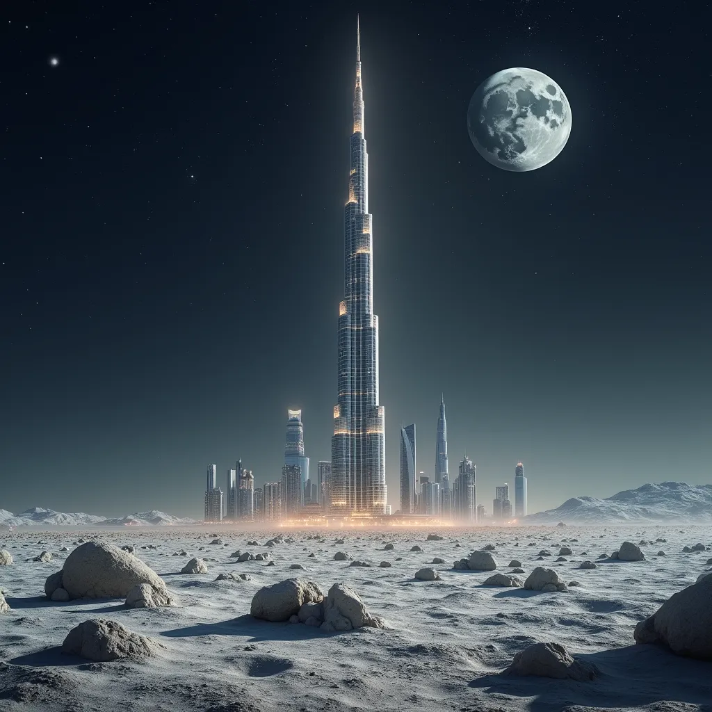 I have a grand and unique vision, wherein the majestic structure of Burj Khalifa stands towering on the barren landscape of the Moon. Picture the world's tallest skyscraper, the jewel of Dubai, making its mark on the moon's surface. Think about the contrast, the gleaming edifice of Burj Khalifa set against the pale, dusty terrene of the lunar land. I want to explore this fantastical concept where human architectural brilliance intersects with the cosmic wilderness. The sight would be nothing less than awe-inspiring, depicting a future where humankind pushes the envelope of what's achievable and establishes their presence beyond the boundaries of Earth, on the moon's land.