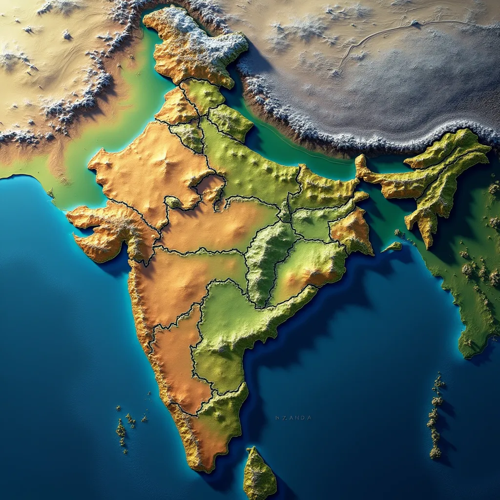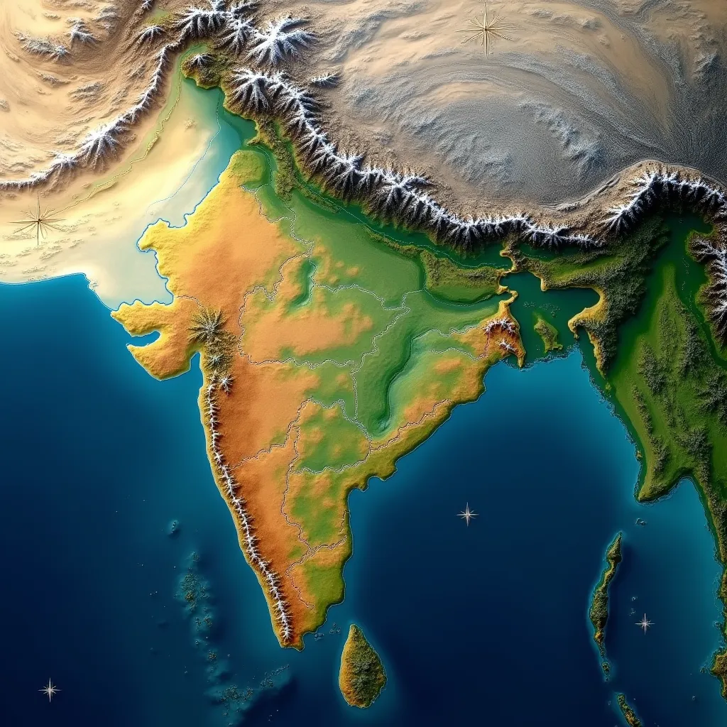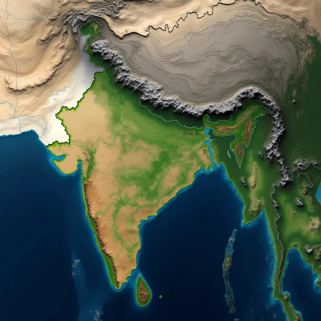 An intricate illustration of India's geographical map captured directly from real space using advanced satellite technologies. The depiction should accurately highlight the country's unique topographical features including the mountain ranges, river systems, plains, and coastal areas along with political boundaries, important cities and landmarks. The map should be able to exhibit the diverse landscapes spanning across the country, from the snow-capped peaks of Himalayas in the North, to the fertile Gangetic plains, the barren Thar Desert in the west, the lush greenery of Western Ghats in the South and the marshy Sundarbans mangroves in the east. The map should also feature India's vast coastline along the Arabian Sea and the Bay of Bengal. Fine detailing of the map will help obtain a deeper understanding of India's geographical variation and strategic location, offering a majestic bird's eye view of the country as observed from outer space.
